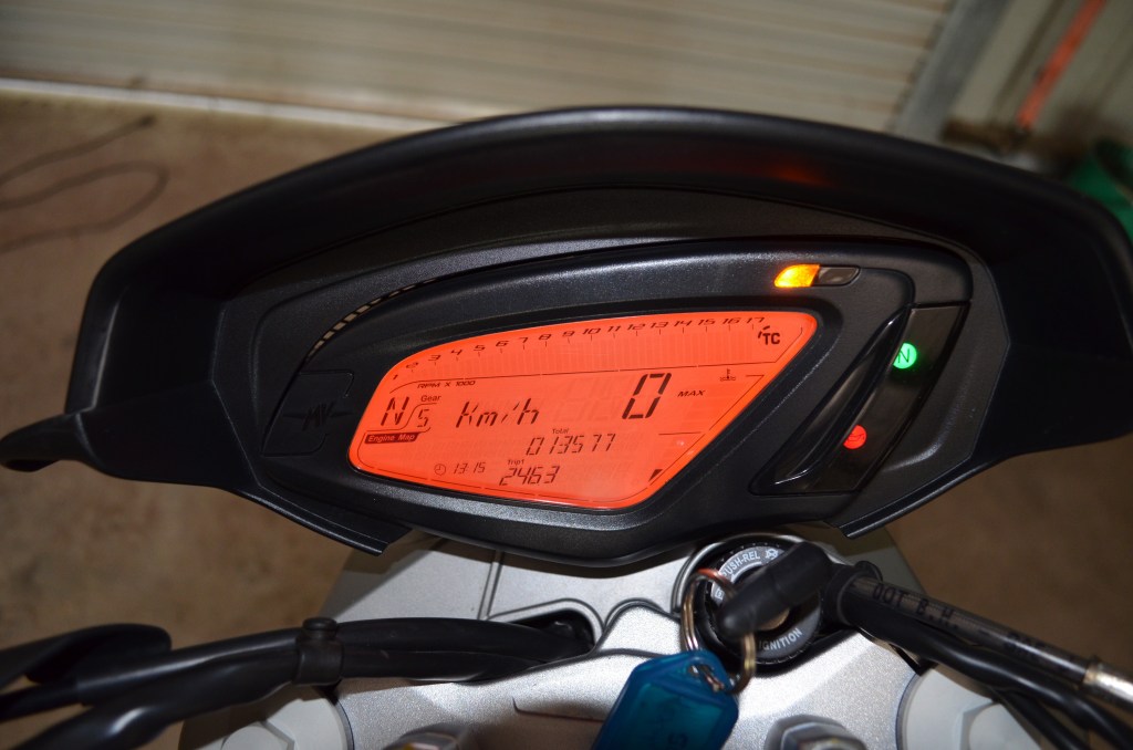 The bike sounds distinctly MV Agusta. If you have heard one, they make a mechanical ‘clatter’ on idle. It’s a good clatter, like having your back gently hit by a masseuse…mmm clatter. The dash is an all-digital affair. Almost everything is on there; lap timer, tachometer, trip meters, engine map, gear indicator, clock. It’s comprehensive and a good unit. It is also easy to use. Next to your left thumb on the handle bars there are 2 soft buttons. These are used to select settings and scroll up/down. This can all be done on the fly too. It’s not perfect (the lap timer is fiddly and sometimes you can hit the wrong button to select) but overall the dash is clear to read and easy to use.