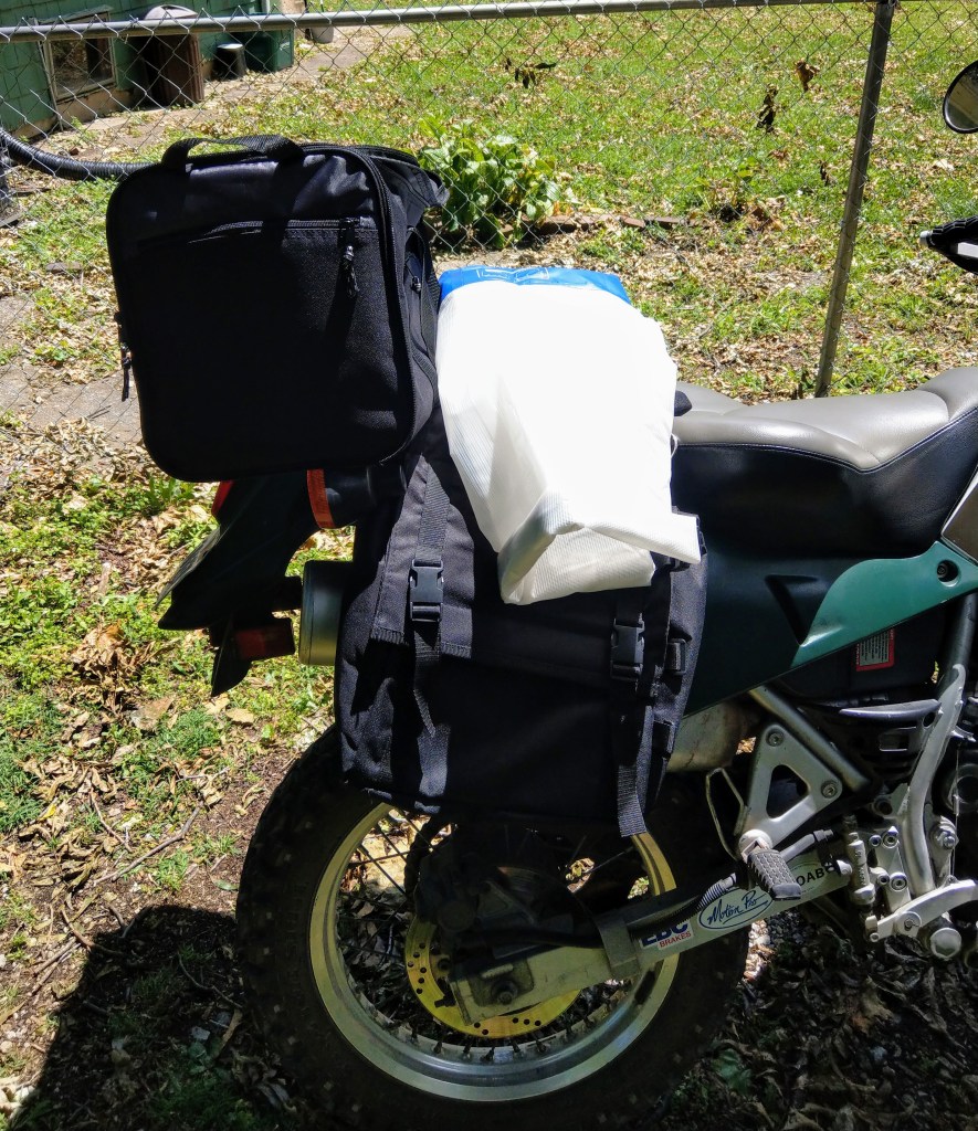 The pannier bags should work perfectly. They sit over the rear seat and allow me to still use the rear for other luggage. I’ll get some cheap bungie cords to tie it down and probably some Rok straps down the line.